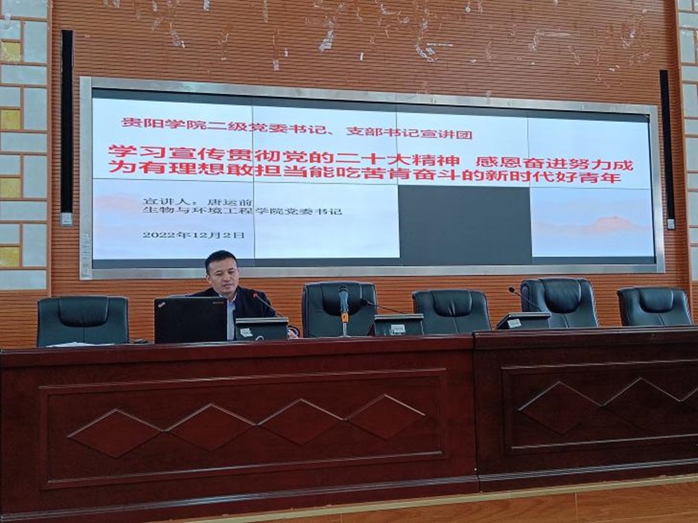 中国共产党第二十次全国代表大会,是在全党全国各族人民迈上全面建设社会主义现代化国家新征程、向第二个百年奋斗目标进军的关键时刻召开的一次重要的大会。奋进新征程,建功新时代。为深入学习宣传贯彻党的二十大精神,2022122日中午生物与环境工程公司党委书记唐运前为员工作“学习宣传贯彻党的二十大精神,感恩奋进努力成为有理想敢担当能吃苦肯奋斗的新时代好青年”的宣讲。宣讲会在公司道德讲堂举行,公司党委副书记高喜明主持,公司2020级全体员工参加。