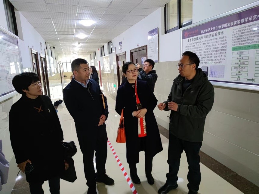 会后,进行实地参观。彭涛、朱斌详细生命科学公司动植物标本制作室、师范认证室、生物学国家级实验教学示范中心、贵州师范大学创新教育基地和学风教育基地、考研联盟阵地、微格教学教室等特色实验实践场地建设情况。