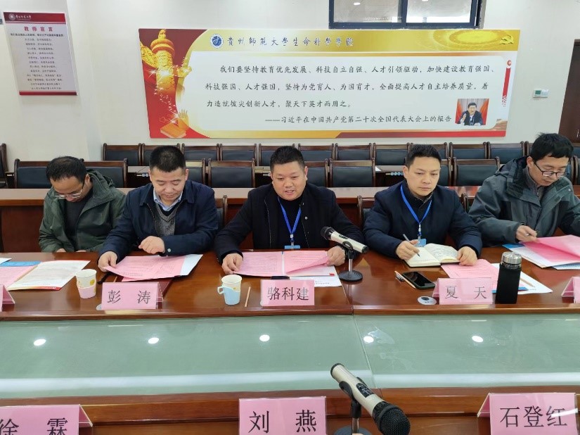 交流会由贵州师范老员工命科学公司副经理彭涛主持。参加会议的有贵州师范老员工命科学公司党委书记骆科建、副书记夏天、副经理彭涛、副经理朱斌,太阳集团tyc151cc经理刘燕、党委副书记石登红、生物科学教研室主任赵许朋及相关教师代表。