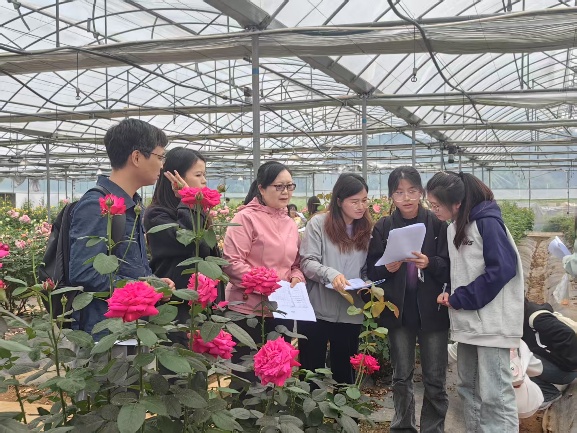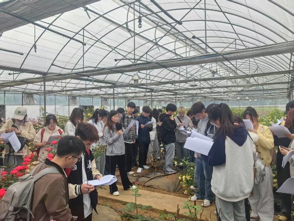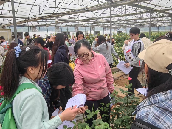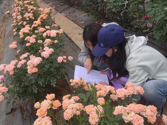 同学们分组对月季新品种性状开展调查,展现出积极的求知欲和科学严谨的调查态度,并将课堂上学习的植物学相关知识在实地中得到应用和巩固。经过一天的实习,同学们既开阔了视野,也顺利完成了一百余种月季新品种性状的调查和记录。